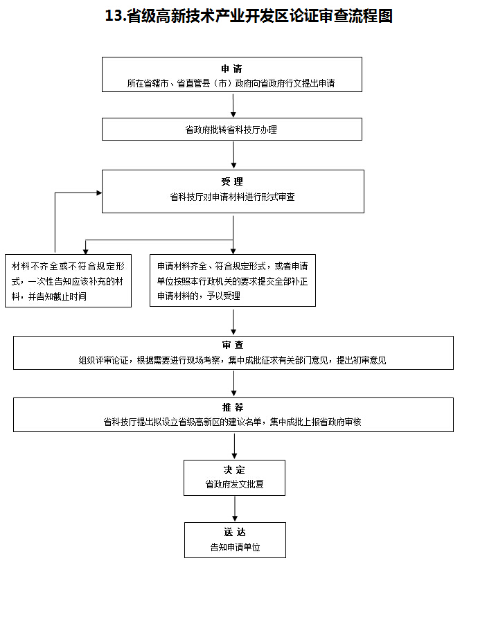 | 14 | 省级高新技术产业开发区论证审查 | 《河南省开发区条例》(2002年9月27日河南省第九届人民代表大会常务委员会第三十次会议修正)第八条:“申报省人民政府批准设立的开发区,应由省辖市人民政府或地区行政公署提出申请,分别经省计划行政管理部门、省科技行政管理部门组织有关单位进行论证和审查,报省人民政府审批。” | 受理 | 1.受理责任:在省辖市人民政府提出申请且省人民政府批转省科技厅具体承办后,一次性告知补正材料;依规受理或不予受理(不予受理的依规告知理由) | 高新处 | 10日 | 不收费 | ||