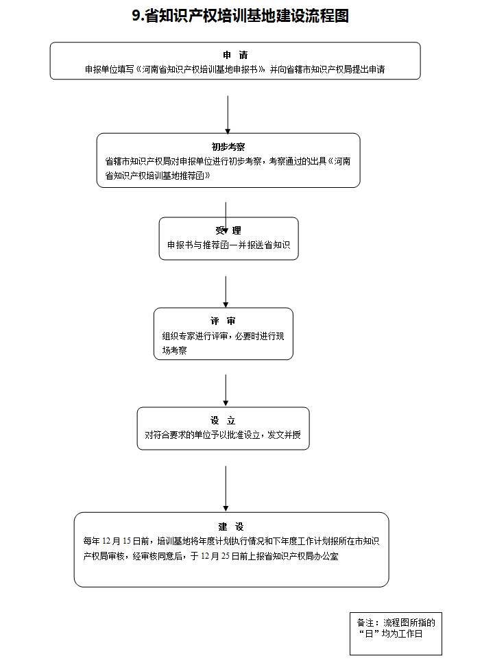 | 评审 | 2.评审责任:组织专家按照《河南省知识产权培训基地管理办法》进行评审,必要时进行现场考察。 | 办公室 | |||||||