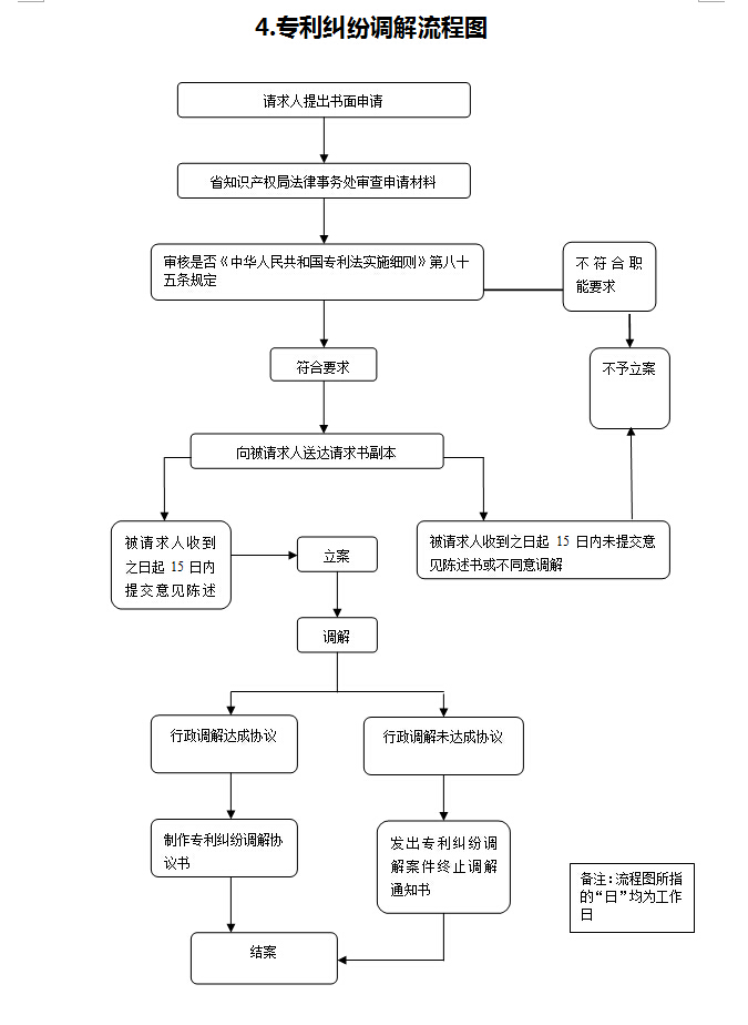 调解 3.调解责任:对双方当事人进行调解。调解达成协议的,专利行政部门制作调解协议书,双方当事人签字或盖章,专利行政部门加盖公章。调解未达成协议的,撤销案件。 法律事务处