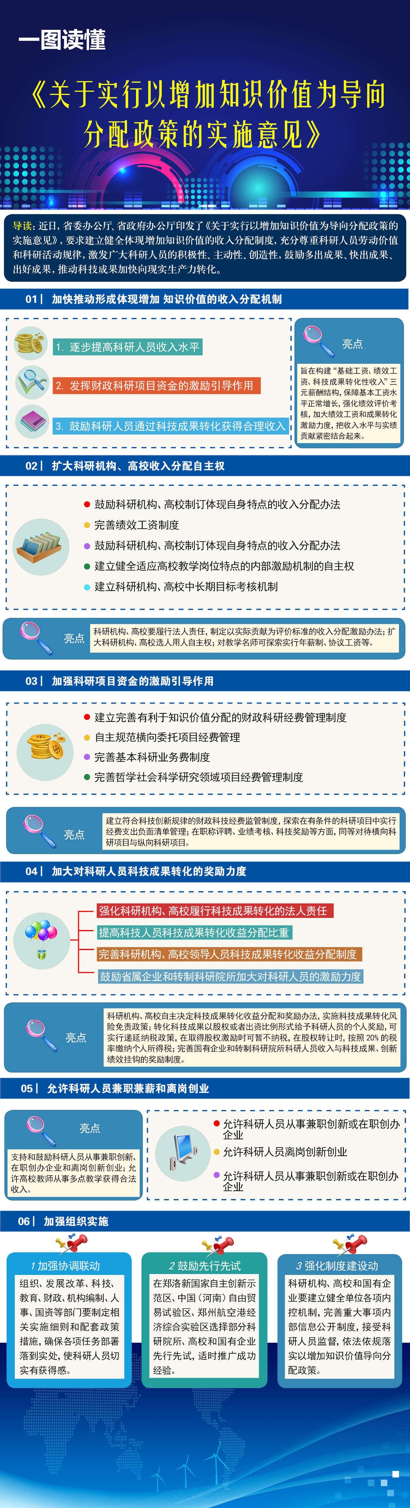 为加快实施创新驱动发展战略,激发科研人员创新创业积极性,2017年10月17日,中共河南省委办公厅、河南省人民政府办公厅出台了《关于实行以增加知识价值为导向分配政策的实施意见》(厅文〔2017〕36号,以下简称《实施意见》)。《实施意见》紧扣《中共中央办公厅、国务院办公厅印发<关于实行以增加知识价值为导向分配政策的若干意见>的通知》(厅字〔2016〕35号)精神,结合我省实际,从扩大科研机构和高校收入分配自主权、加强科研项目资金的激励引导作用、加大对科研人员科技成果转化的奖励力度、允许科研人员兼职兼薪和离岗创业等方面出台了一系列具体政策措施,加快推动形成体现增加知识价值的收入分配机制,着力激发广大科研人员的积极性、主动性、创造性,鼓励多出成果、快出成果、出好成果,推动科技成果加快向现实生产力转化。主要内容有: